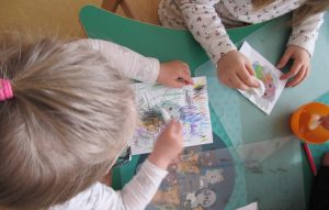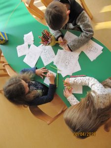Das Speiseöl auf Papier getupft, ließ unsere ausgemalten Osterbilder transparent werden und es entstanden tolle Fenster Bilder.
